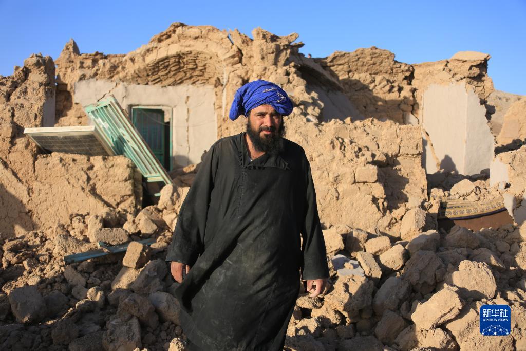 10月8日,一名村民站在阿富汗赫拉特省津達詹區震後坍塌的房屋前。