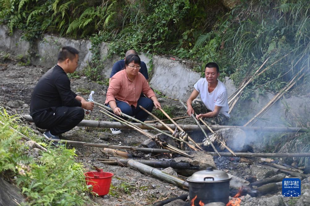楊寧(左二)和鄰村(吉曼村)村民們在田邊做午飯,準備協商山泉水引水工程相關事宜(10月8日攝)。新華社記者 黃孝邦 攝