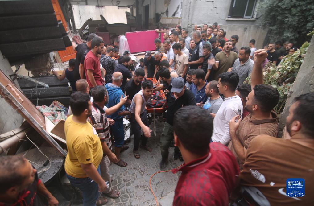 10月9日,在加沙地帶南部城市拉法,人們從以色列空襲後的建築中抬出一名搜尋到的受害者。