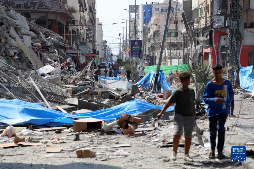 10月8日,巴勒斯坦人在加沙城查看以色列空襲後的街道。