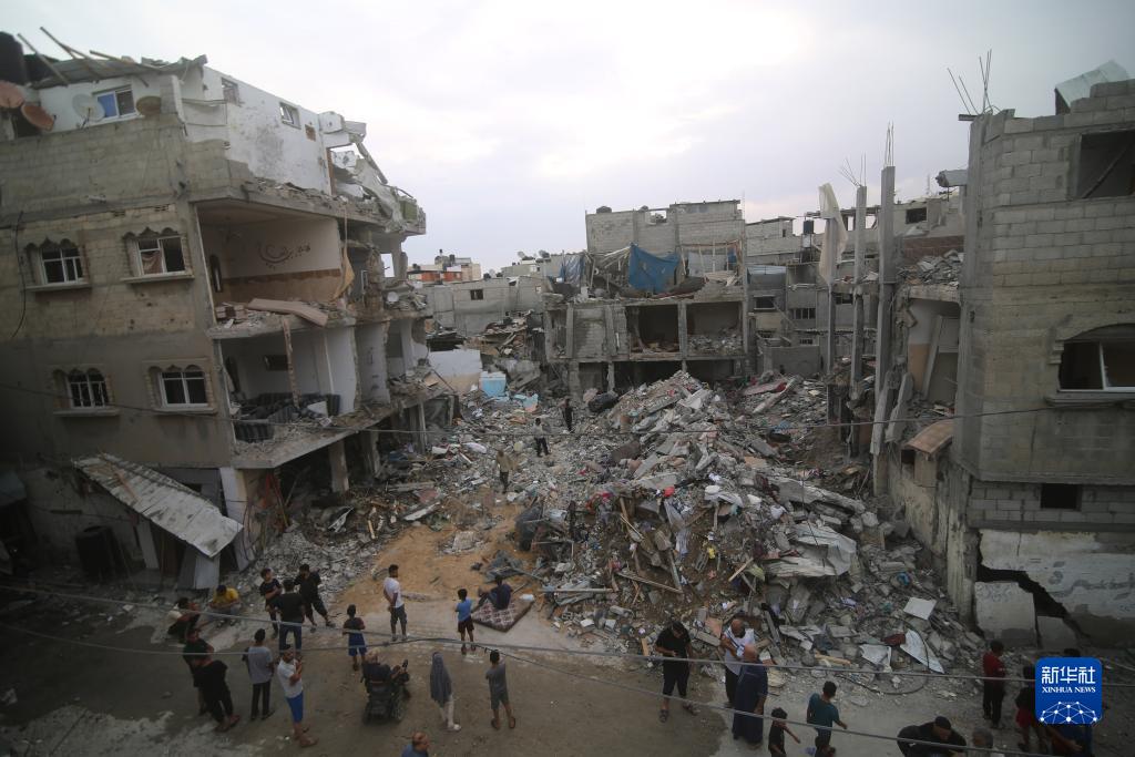 10月9日,在加沙地帶南部城市拉法,人們聚集在以色列空襲後的建築廢墟旁。