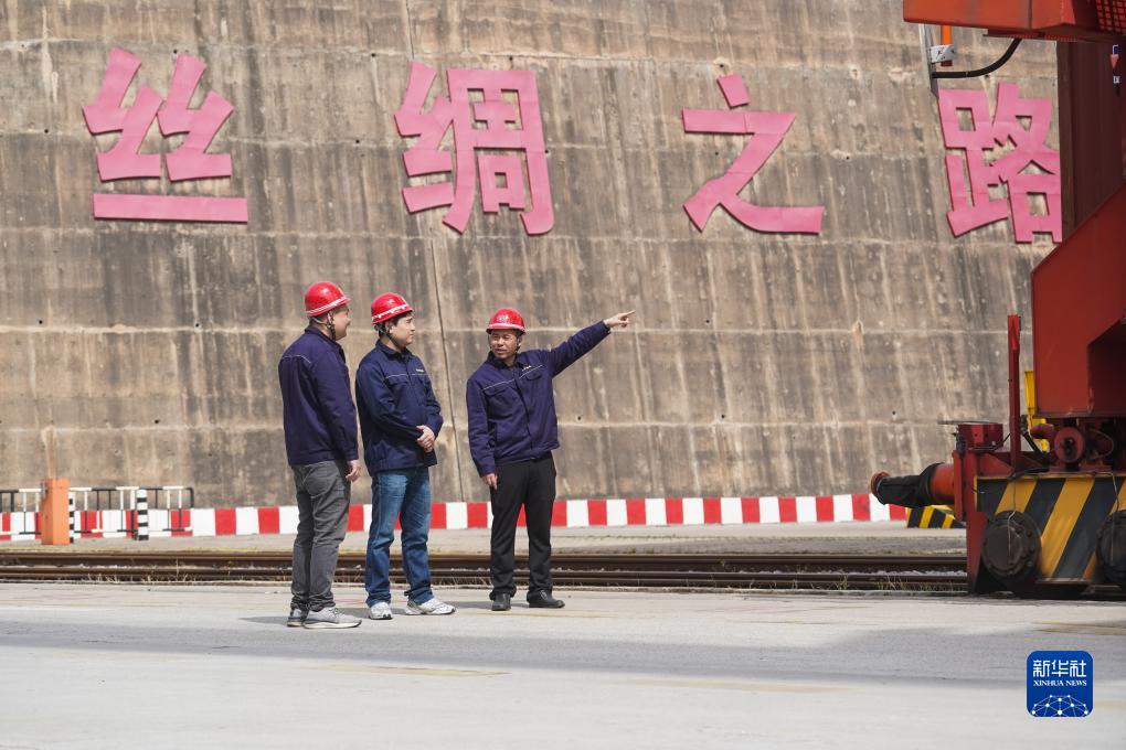 5月10日,在中哈連雲港物流合作基地,來自哈薩克斯坦的連雲港中哈國際物流有限公司副總經理阿孜(中)、業務員馬合江(左)和中方同事交流。