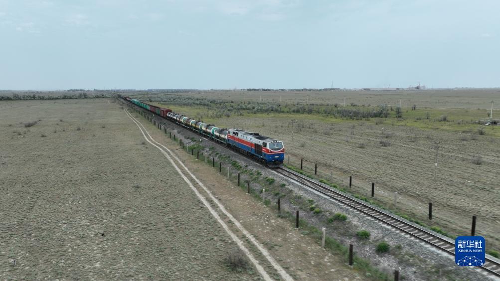 5月12日,在哈薩克斯坦阿拉木圖附近,貨運列車馳騁於阿拉木圖與霍爾果斯間(無人機照片)。