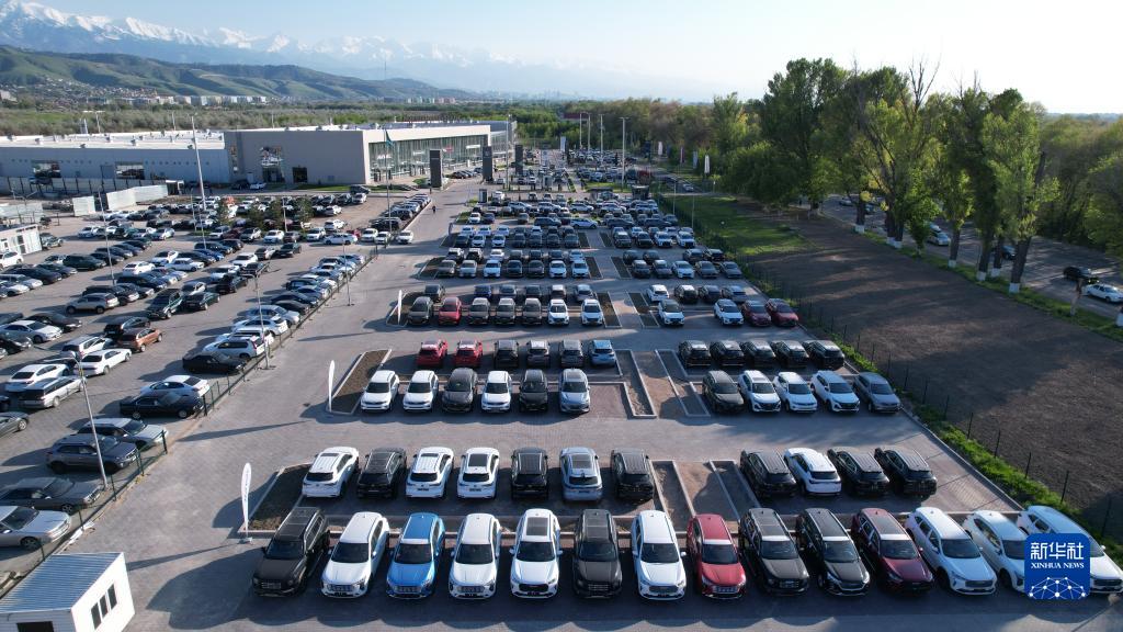 5月5日,汽車停放在哈薩克斯坦阿拉木圖一家大型二手車交易市場(無人機照片)。據阿拉木圖當地二手車市場經銷商介紹,許多中日韓品牌汽車零配件均通過中歐班列運抵哈薩克斯坦境內。