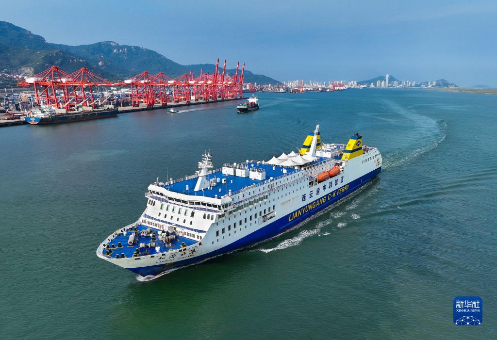 2022年9月7日,一艘遠洋輪船從江蘇連雲港港駛出(無人機照片)。