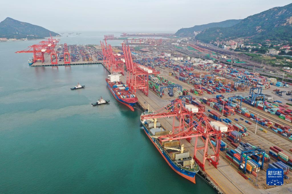 5月9日,貨輪停靠在連雲港港集裝箱碼頭(無人機照片)。
