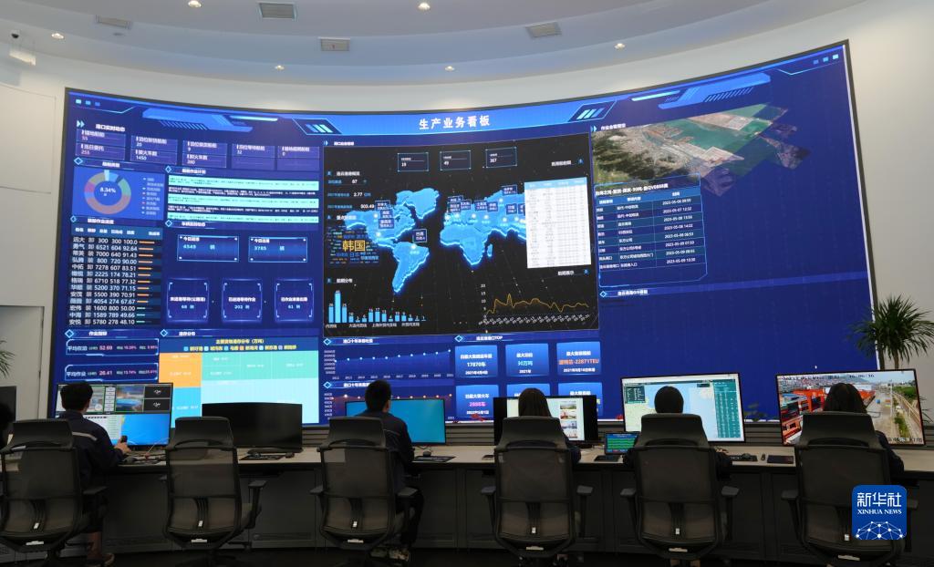 5月9日,工作人員在江蘇連雲港的中哈連雲港物流合作基地數字化調度中心查看港口作業情況。