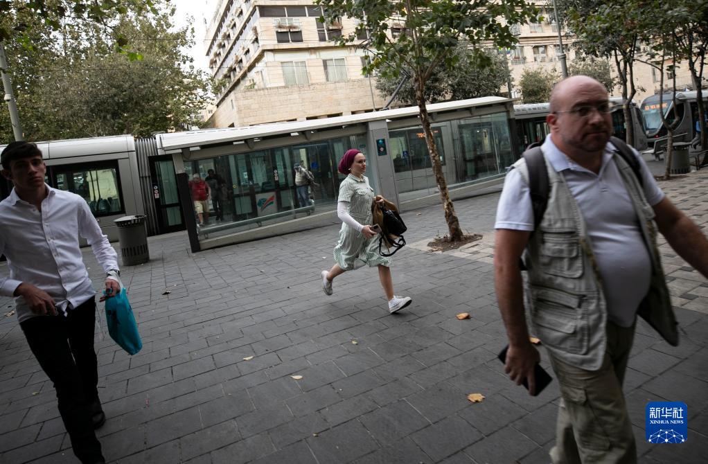 10月9日,在耶路撒冷街頭,人們在防空警報響起時衝向避難設施。