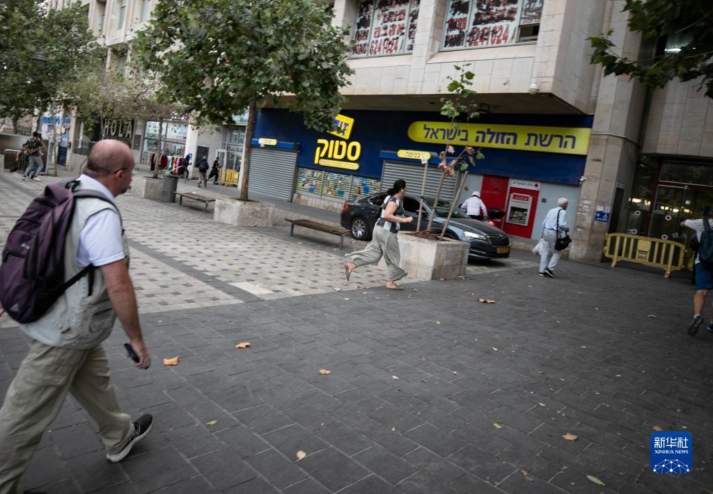 10月9日,在耶路撒冷街頭,人們在防空警報響起時衝向避難設施。