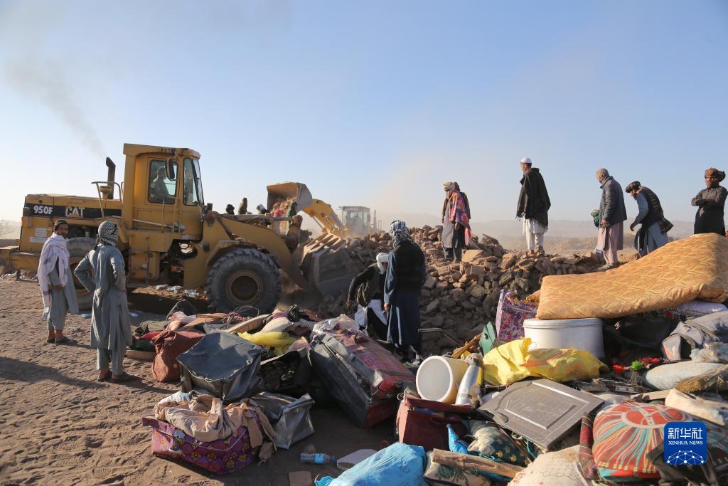 這是在阿富汗西部赫拉特省津達詹區拍攝的救援人員從地震廢墟中挖掘出的居民物品(10月9日攝)。