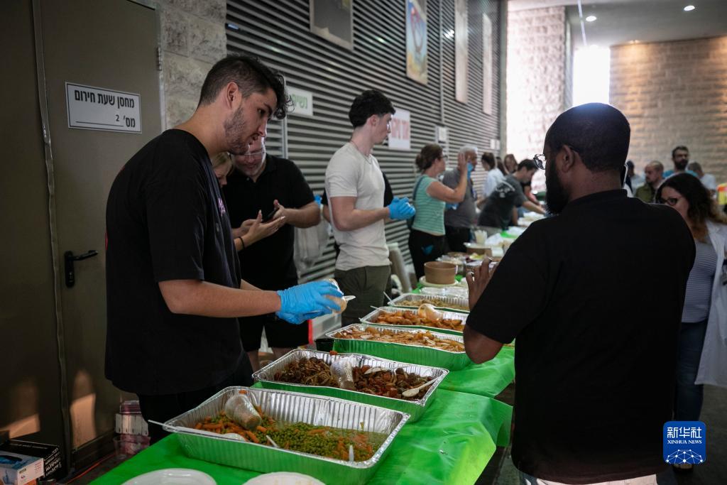10月9日,在以色列南部城市阿什凱隆一家大型醫院,志願者向民眾分發食物。