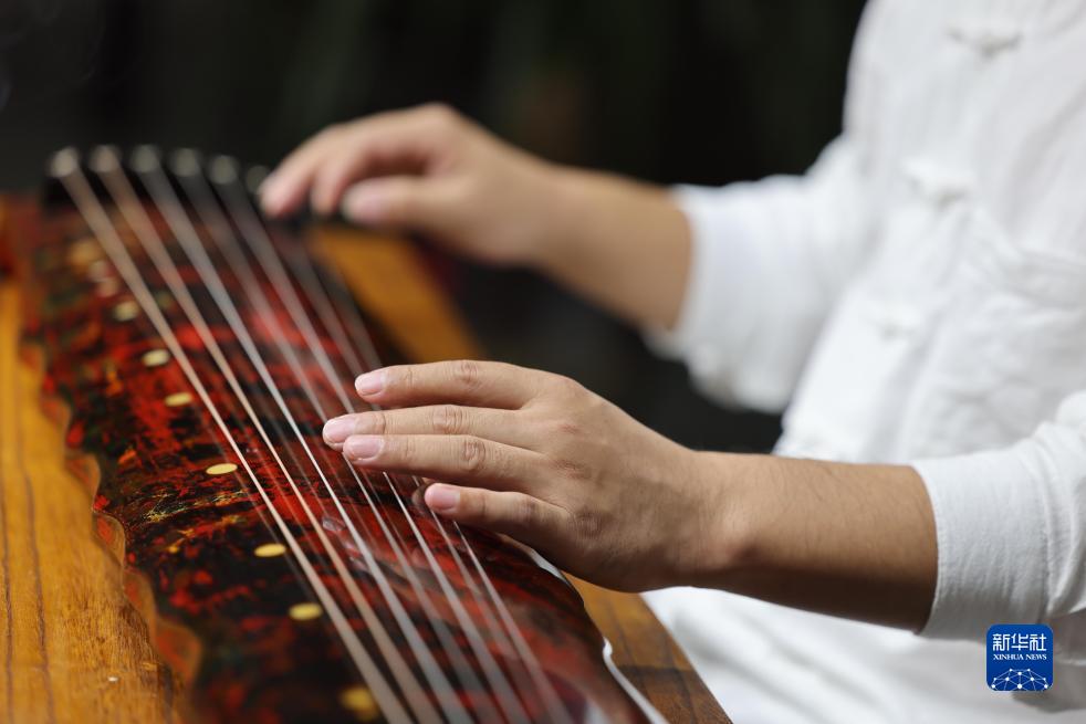 10月9日,河南省蘭考縣堌陽鎮善斫琴社的斫琴師徐冰在彈奏古琴。