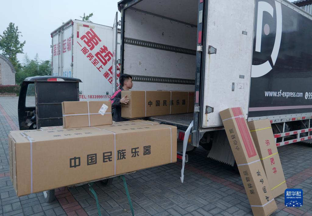 10月9日,在河南省蘭考縣堌陽鎮徐場村,快遞員將樂器成品裝車。