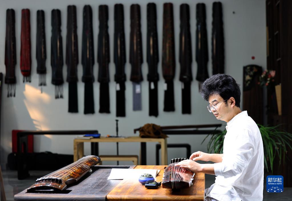 10月9日,河南省蘭考縣堌陽鎮善斫琴社的斫琴師徐冰在彈奏古琴。