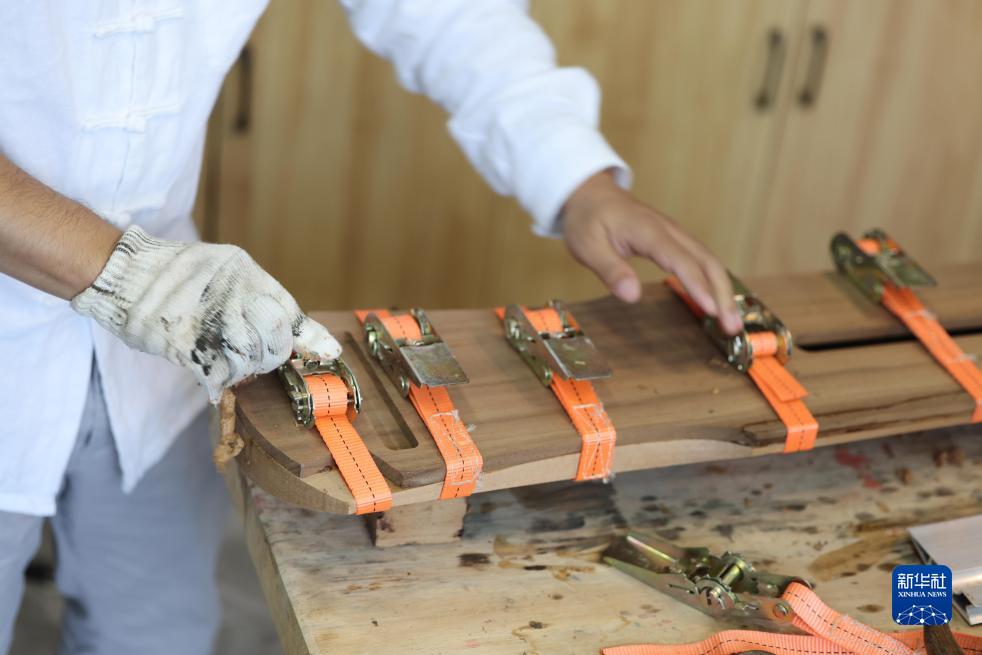 10月9日,河南省蘭考縣堌陽鎮善斫琴社的斫琴師徐冰在製作古琴。