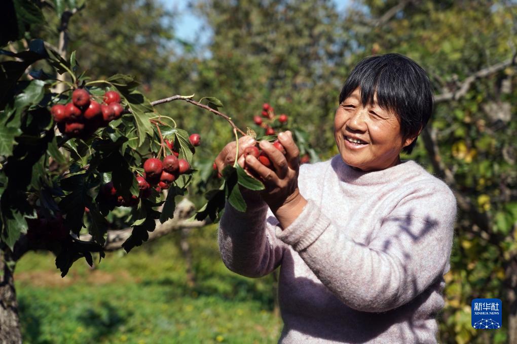 10月10日,村民在北京市平谷區熊兒寨鄉魏家灣村的一處紅果種植園採摘紅果。