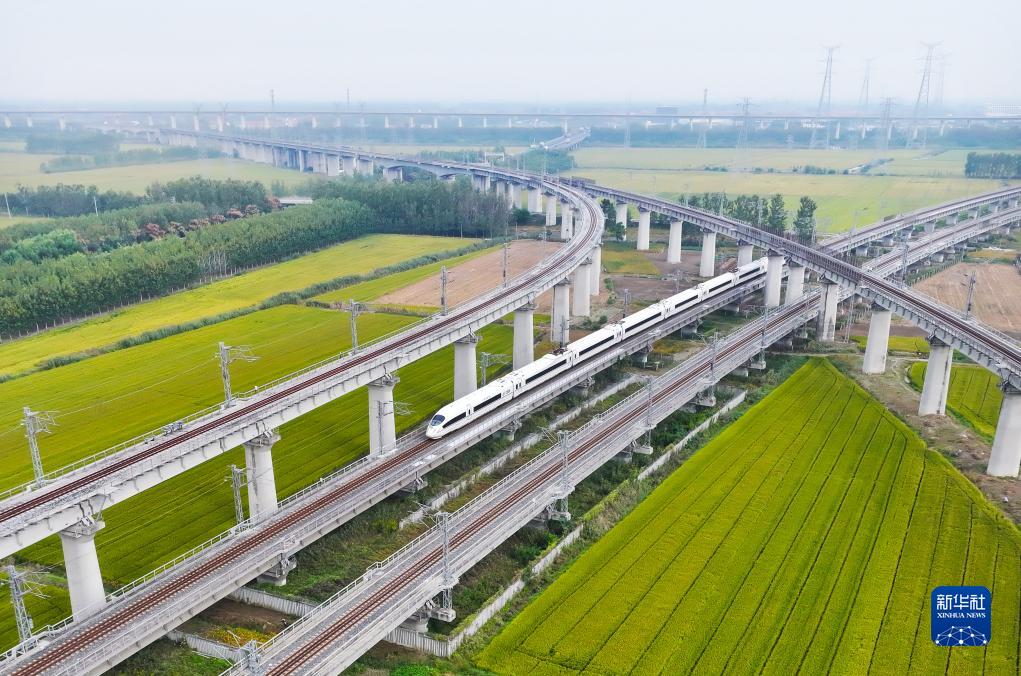10月10日,一列動車組列車行駛在江蘇連雲港市(無人機照片)。