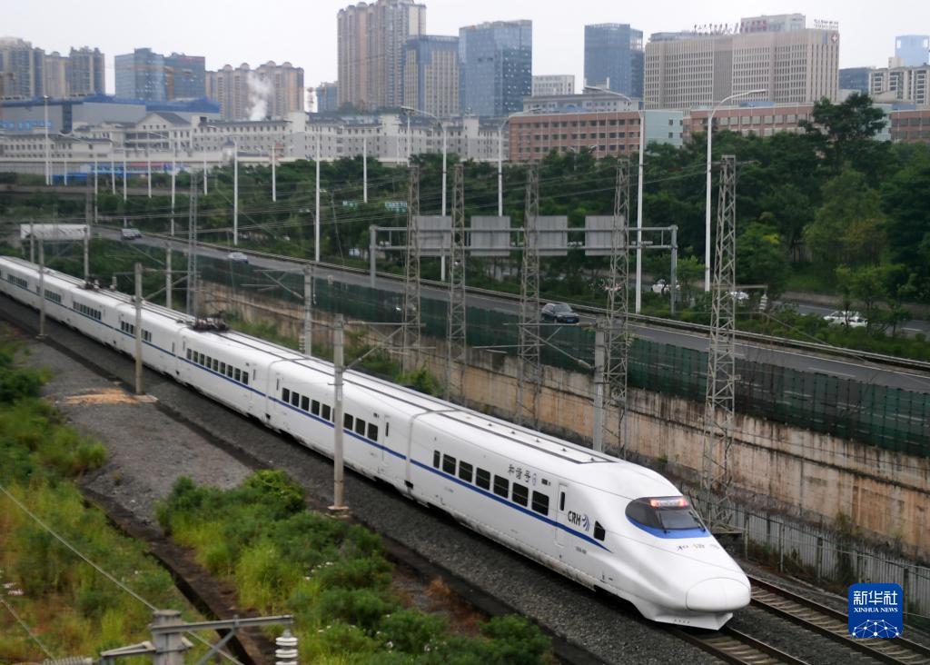 10月10日,一列動車組在廣西南寧市區內行駛。