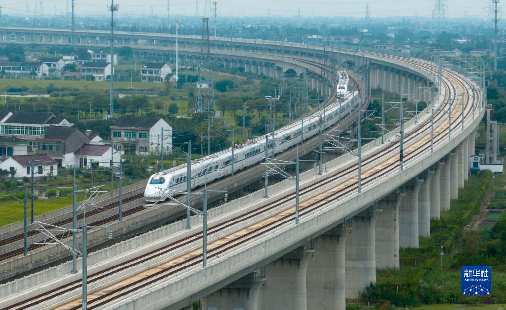 10月10日,列車行駛在滬蘇通鐵路江蘇省太倉市境內(無人機照片)。