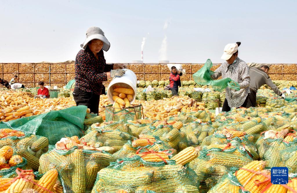金秋時節,河北各地秋糧進入大面積收穫期,農民利用晴好天氣開展秋糧晾曬、收儲等工作,確保秋糧入倉。