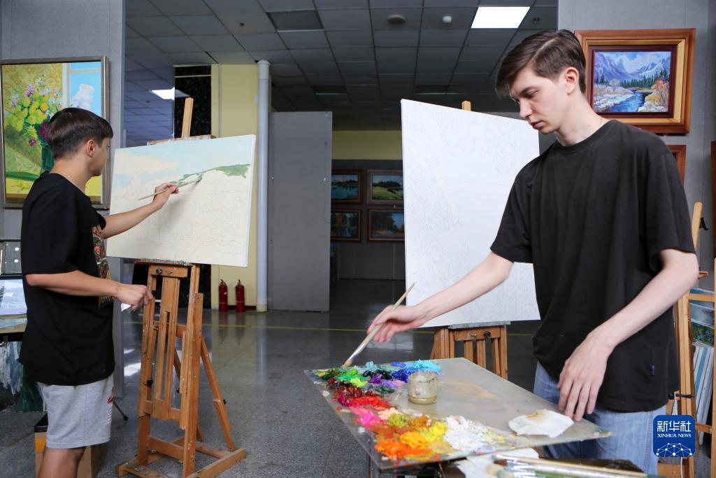 8月9日,從俄羅斯來華交流的老師在中國黑河俄羅斯油畫城現場作畫。