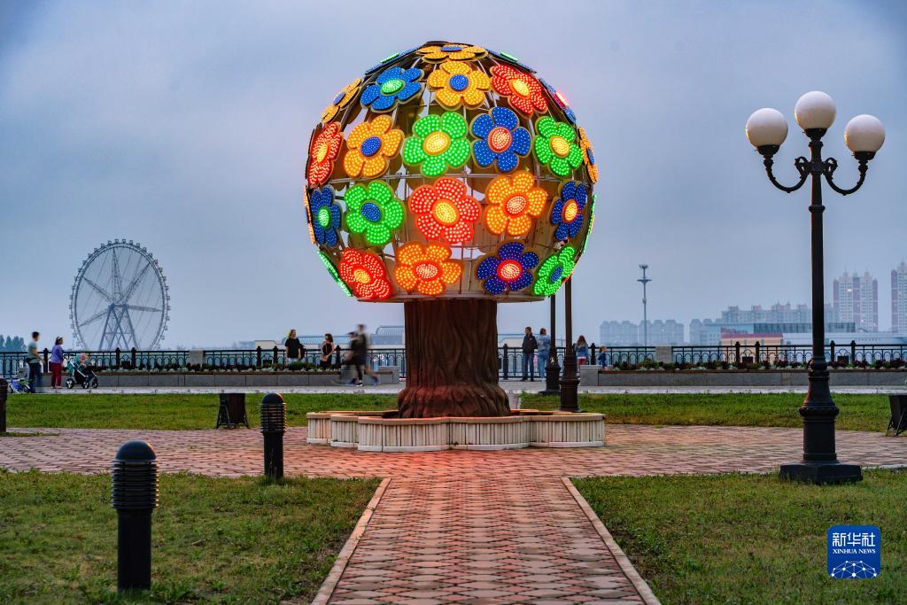 7月24日傍晚,俄羅斯布拉戈維申斯克市河堤上的景觀蘑菇燈被點亮。