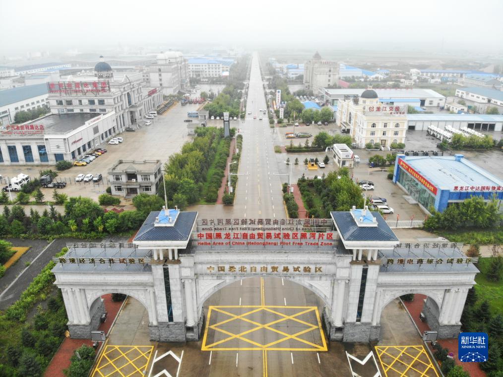 這是8月10日拍攝的中國(黑龍江)自由貿易試驗區黑河片區一角(無人機照片)。中國(黑龍江)自由貿易試驗區黑河片區被稱為“中國最北自貿片區”。