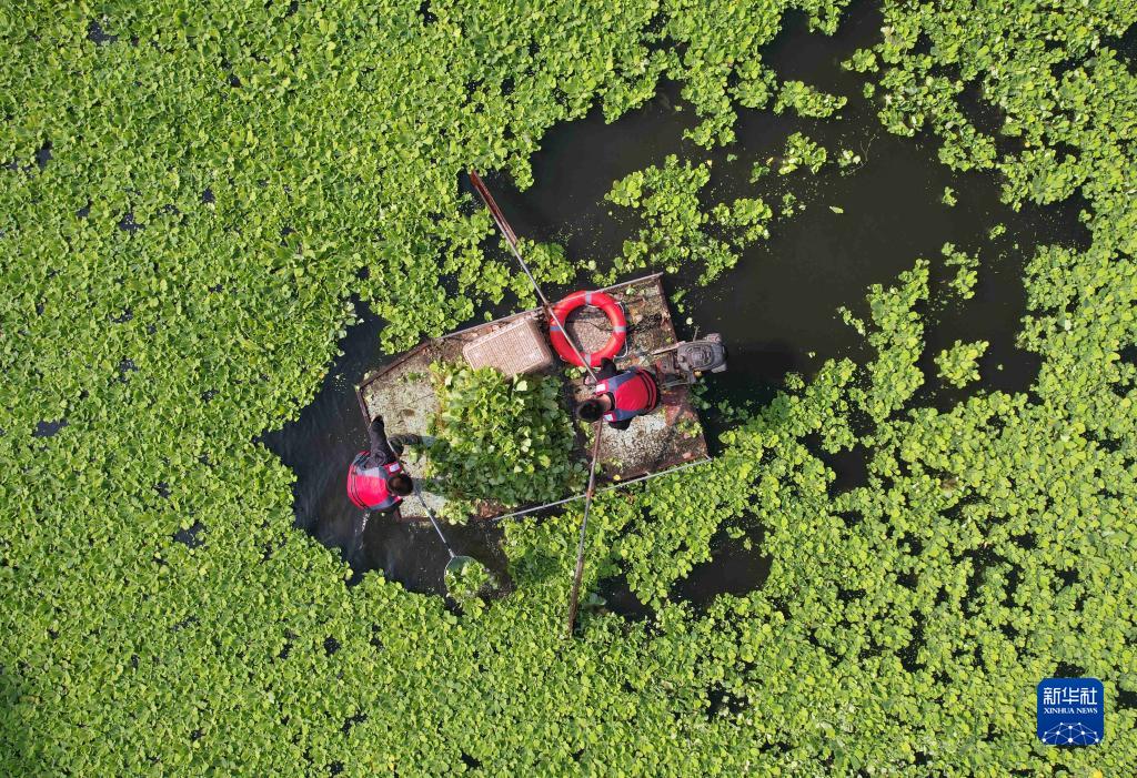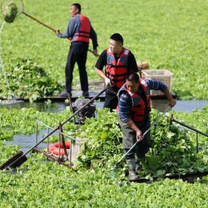 當日,山東省臨沂市沂南縣環保、水利等部門組織作業人員對沂河流域大莊段水域入侵的水生植物大薸進行打撈清運。近年來,沂南縣全力推進水生態環境保護,對轄區水域進行全面整治,守護綠水青山。