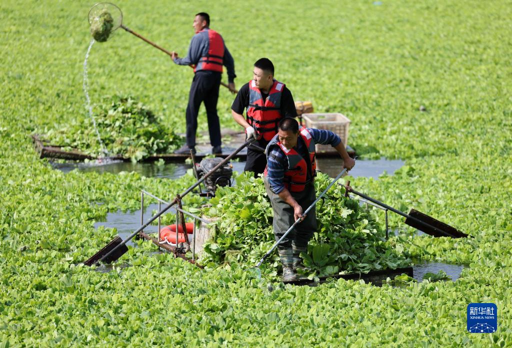當日,山東省臨沂市沂南縣環保、水利等部門組織作業人員對沂河流域大莊段水域入侵的水生植物大薸進行打撈清運。近年來,沂南縣全力推進水生態環境保護,對轄區水域進行全面整治,守護綠水青山。