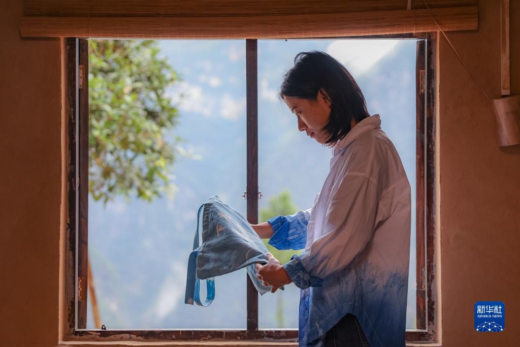 10月10日,在重慶市巫山縣竹賢鄉下莊村,袁孝鑫在檢查扎染産品的質量。