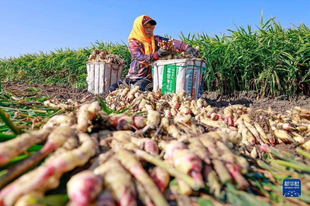 10月10日,河北省唐山市豐南區岔河鎮楊義口頭三村的農民在收穫生薑。