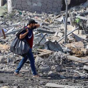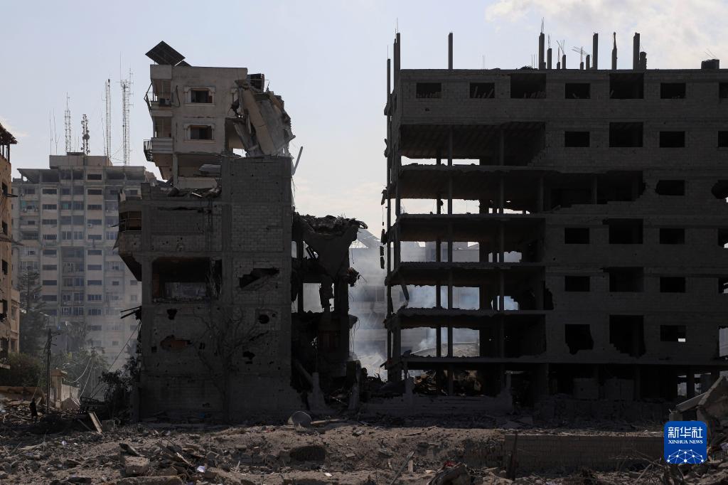 這是10月10日在加沙城拍攝的被以色列空襲炸毀的建築廢墟。