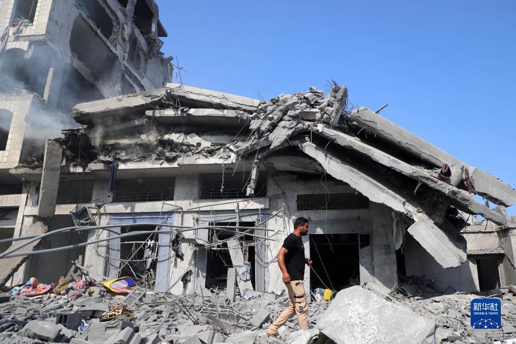 這是10月10日在加沙城拍攝的被以色列空襲炸毀的建築廢墟。