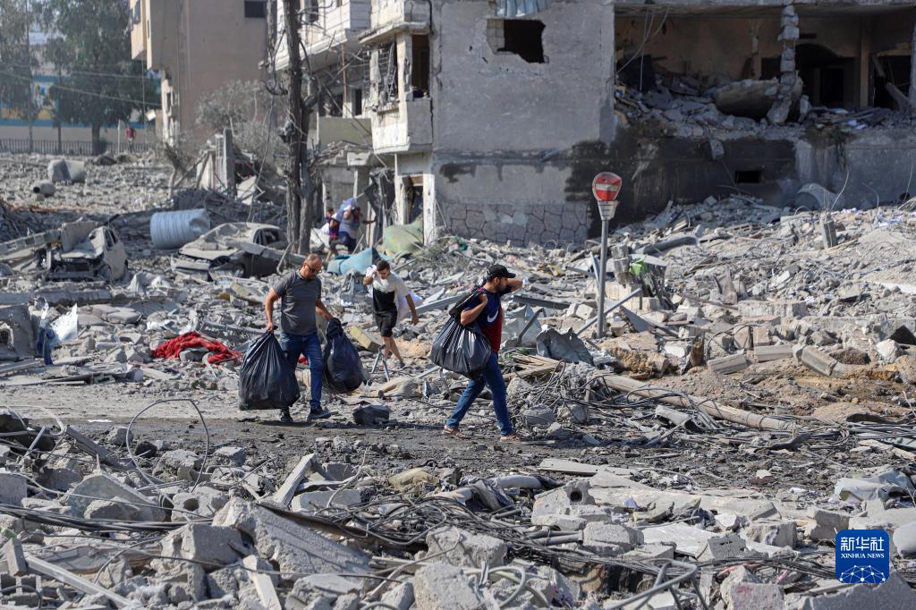 10月10日,在加沙城,人們走過被以色列空襲炸毀的建築廢墟。