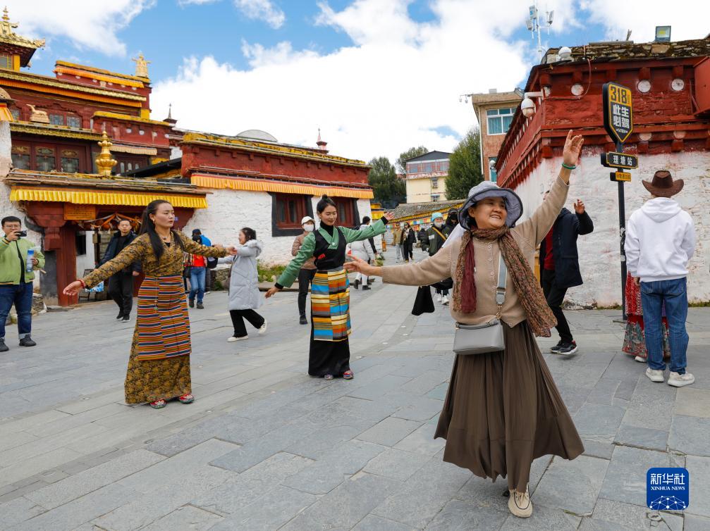 10月10日,游客(前)在理塘縣勒通古鎮跟着當地藏族群眾跳鍋莊舞。