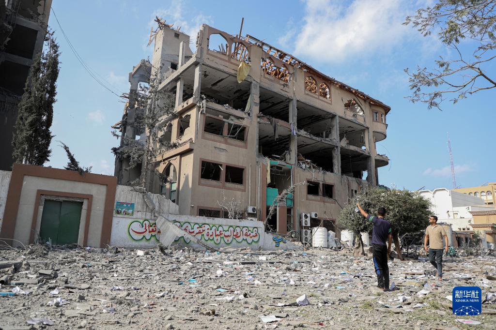 10月10日,在加沙城,人們走過被以色列空襲炸毀的建築廢墟。