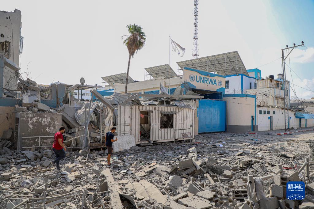 10月10日,在加沙城,人們走過被以色列空襲炸毀的建築廢墟。