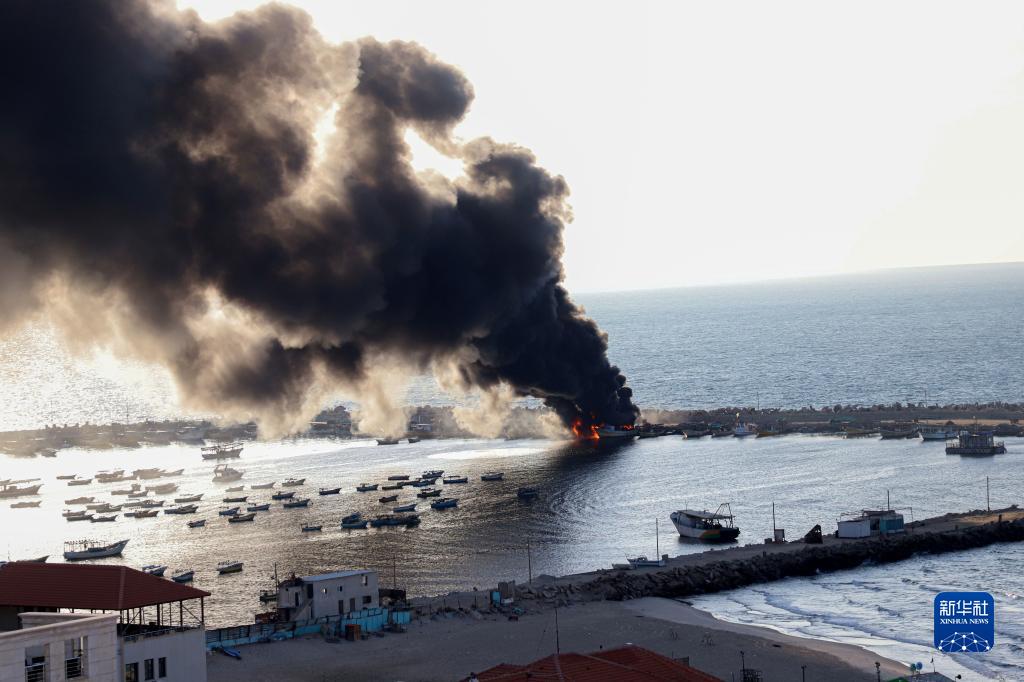 10月10日,加沙城港口遭以色列襲擊後升起濃煙。
