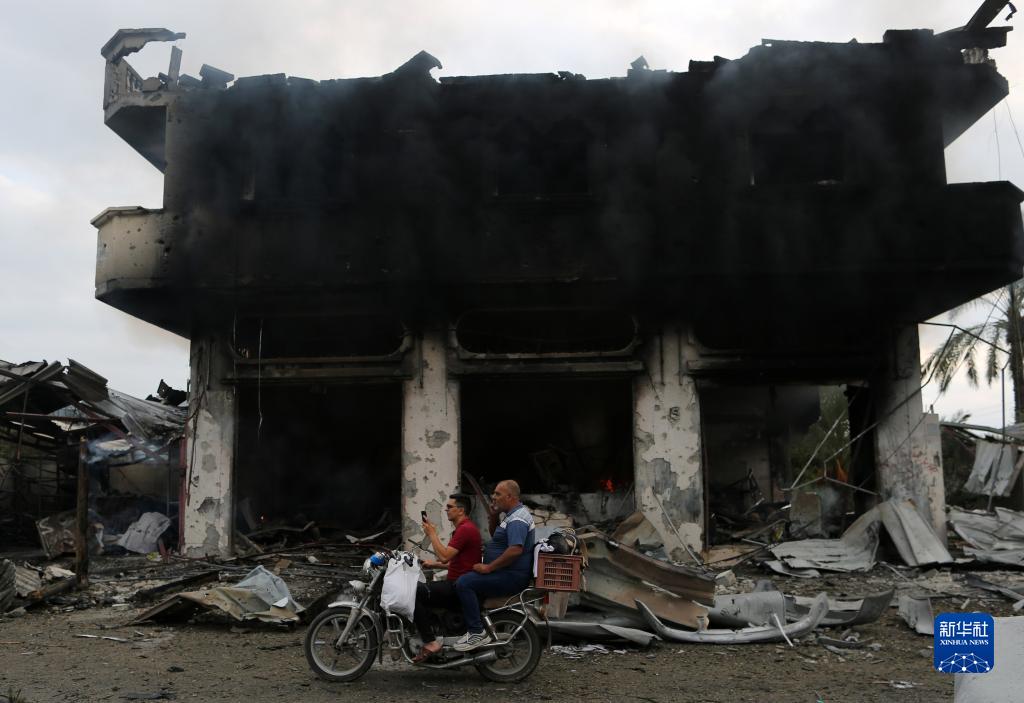 10月10日,在加沙地帶南部城市汗尤尼斯,人們經過被以色列空襲炸毀的建築廢墟。