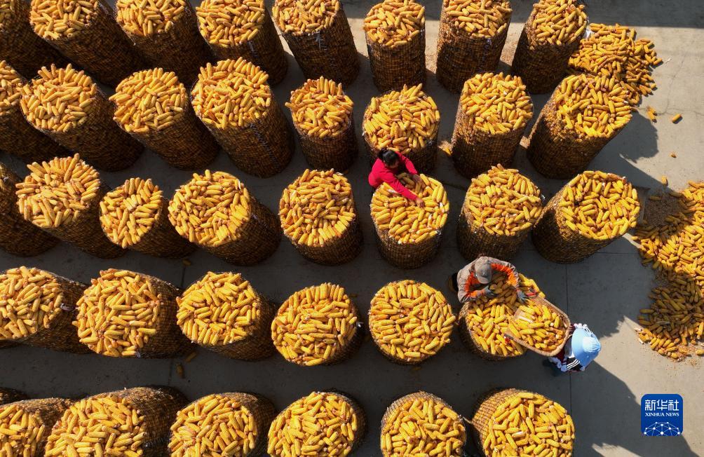 10月10日,河北省遵化市劉備寨鄉尚莊屯村的農民將收穫的玉米裝入糧囤(無人機照片)。