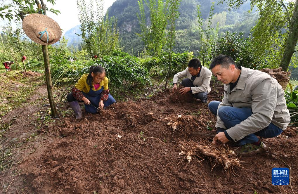 10月10日,在重慶市石柱土家族自治縣中益鄉華溪村,村民在種植園內收穫黃精。