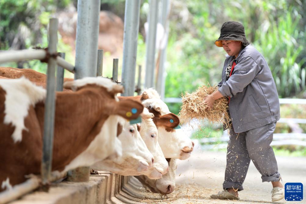 工人在貴州省黔東南苗族侗族自治州黃平縣新州鎮黃飄村給自家飼養的牛投飼料(2023年5月18日攝)。近年來,黃平縣依託交通和生態資源優勢,以循環經濟、智慧養殖為特色,大力發展生態肉牛養殖産業,輻射帶動周邊企業和群眾建成種養結合、農牧循環、加工銷售為一體的全産業鏈發展模式。