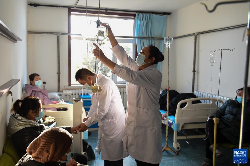 在內蒙古錫林郭勒盟西烏珠穆沁旗的巴彥高勒衞生院,院長姚春明和妻子陳麗華為前來就診的牧民輸液(2023年1月7日攝)。他們在這裡已經工作了20個年頭。