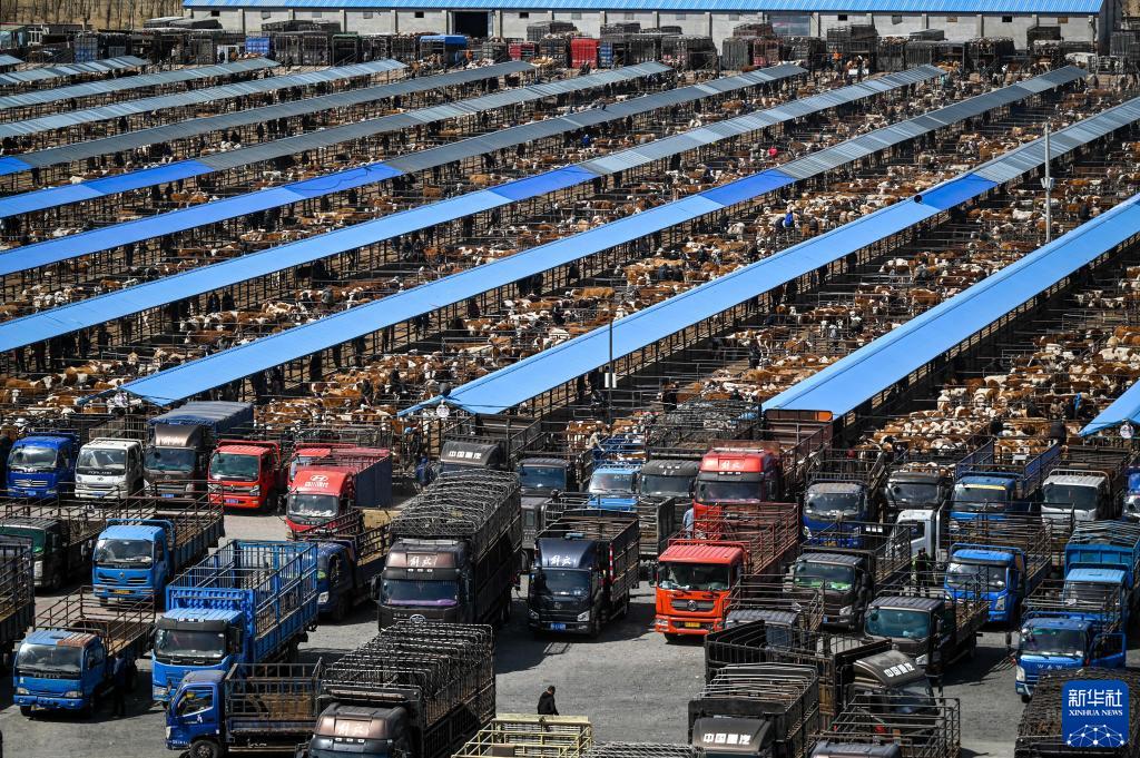 這是繁忙的內蒙古通遼市科爾沁左翼中旗舍伯吐鎮成峰牲畜交易市場(2023年4月12日攝)。