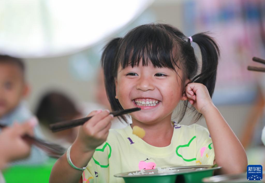 貴州省從江縣剛邊壯族鄉中心幼兒園的小朋友在享用免費營養午餐(2023年9月15日攝)。近年來,多地持續推進農村學生營養午餐關愛工程、免費午餐等項目,針對當地學生的膳食習慣,科學合理搭配菜品、果品,切實提高膳食結構和質量,確保學生吃得飽、吃得好,保障學生健康快樂。
