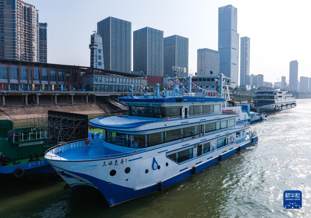 10月11日,啟航前的“三峽氫舟1”號停靠在湖北宜昌三峽游客中心(無人機照片)。