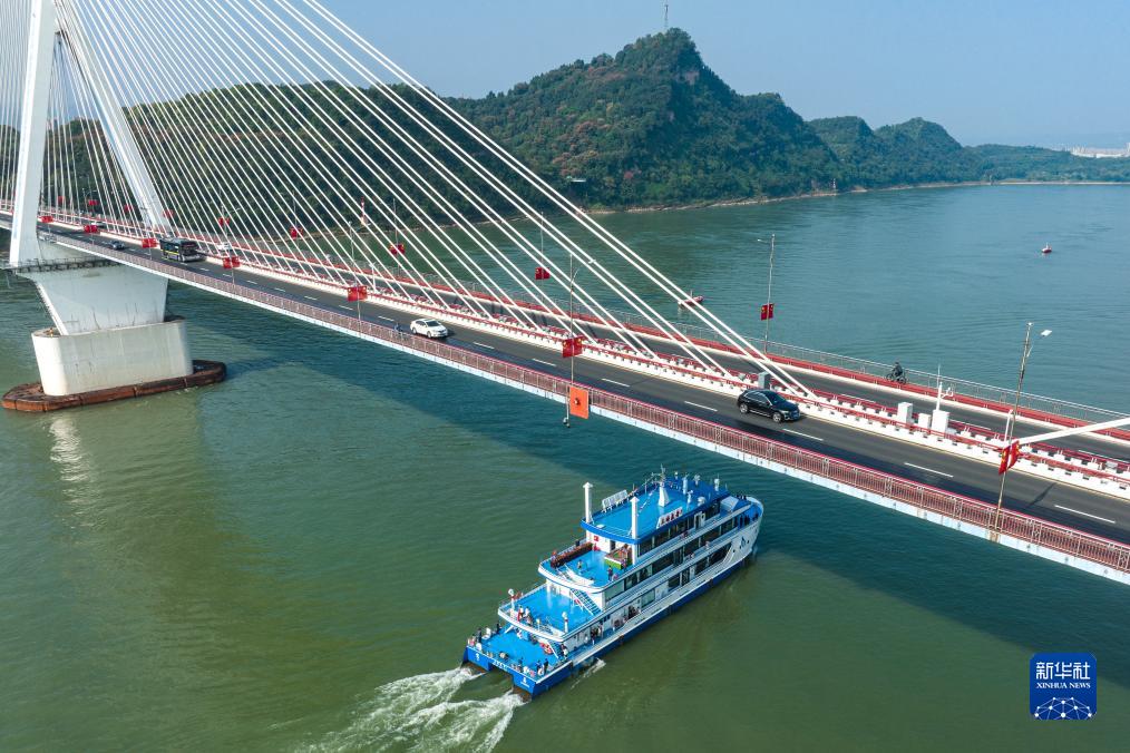 10月11日,“三峽氫舟1”號行駛在長江湖北宜昌水域(無人機照片)。
