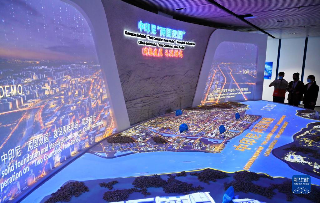 這是2022年11月16日拍攝的福州元洪投資區元洪食品數字經濟産業中心的中印尼“兩國雙園”沙盤和項目介紹。中印尼“兩國雙園”是以福建福州元洪投資區和印尼的民丹工業園等園區為載體,探索建立産業互聯、設施互通、政策互惠的雙園結對合作機制。