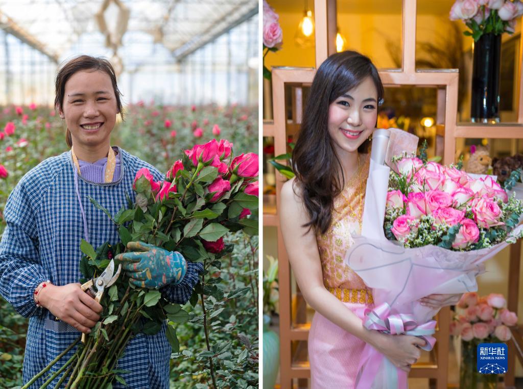 拼版照片顯示,左圖:2019年2月15日,在中國雲南石林彝族自治縣錦苑花卉産業園,花農抱着鮮花微笑(新華社記者 胡超 攝);右圖:2019年2月16日,在泰國曼谷,一位女士抱着購買到的鮮花微笑(新華社記者 張可任 攝)。