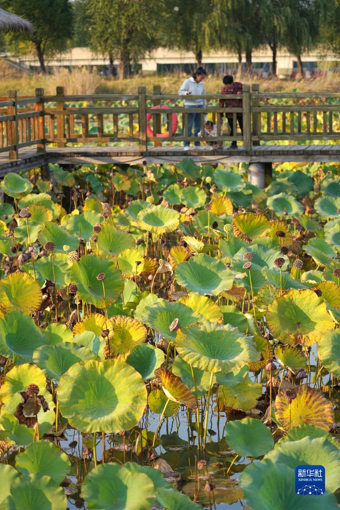 10月10日,游客在山東聊城位山黃河公園裏游覽。